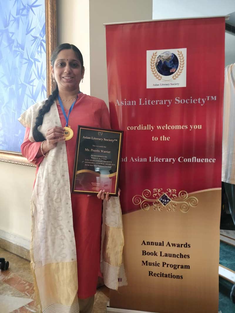 We congratulate our staff Prof. Preethi Warrier for winning Indian Women Achievers Award 2020 at Asian Literary Society and third Prize in the Asian Literary Society’s, 1st Gitesh-Biva Memorial Award 2019, for her short story, ‘Orphaned For Good.’ She has also won awards at TOI Write India Season 1 and blogging portals like Womens’ Web and Momspresso.