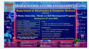 Department of Electronics and Computer Science, organized a five-week OFFLINE Internship on “IoT Hardware, Software, and Applications” from 06th June 2022 to 11th July 2022.This five-week Internship was conducted and coordinated by Prof. Santosh Kamble and Prof. Anita Nalawade, from Electronics and Computer Science department, Shah and Anchor Kutchhi Engineering College. The internship was conducted completely OFFLINE. In this, internship students learned about different IoT boards, thing speak cloud, firebase and Rpi. The competition was organized for encouraging innovative ideas of students, preparing students for industrial environment, giving good exposure on emerging IoT technology. The judge from IT department Prof.Smita Bansod assessed the projects and declared two winners Ms.Madhavi More and Mr. Jash Shah. This internship was organized under guidance of Hod. Dr. Subha Subramanian.