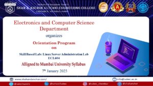 Orientation Program on Skill-based lab: Linux Server Administration Lab (ECL604), Sem VI, Electronics and Computer Science revised 2019 C syllabus scheme was held on 7th January 2023, organized by Electronics and Computer Science department. The orientation was conducted by Prof. Vaibhav Godbole, Assistant Professor, Fr. CRCCE. Discussions were made regarding the syllabus, assessment methods, and scope of enhanced learning The session was