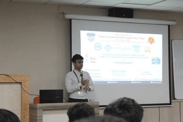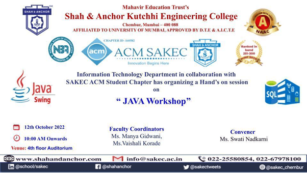 The Information Technology Department, in collaboration with SAKEC ACM Student Chapter, organized an event on “Java Workshop” on 12th October , 2022 . The speakers of the event were Mr. Naman Desai and Mr. Aditiya Jaiswal . An informative workshop was attended by SE students in large numbers.