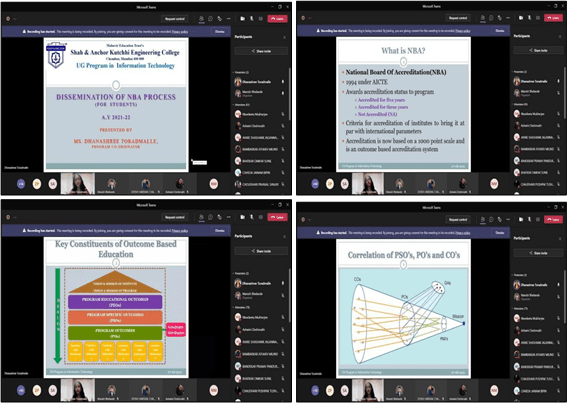 The Information Technology department had organized “Dissemination of NBA Process to students” event on 12th August 2022 in the 4th floor auditorium. Ms. Dhanashree Toradmalle, Program Coordinator of IT gave introduction of NBA process to SE, TE and newly joined IT students. It helped the students to understand the significance of the accreditation process.
