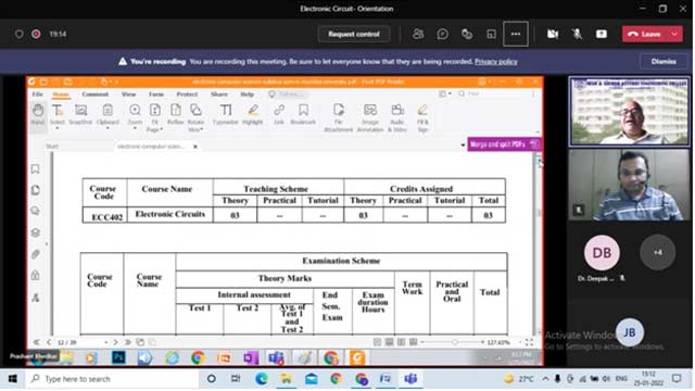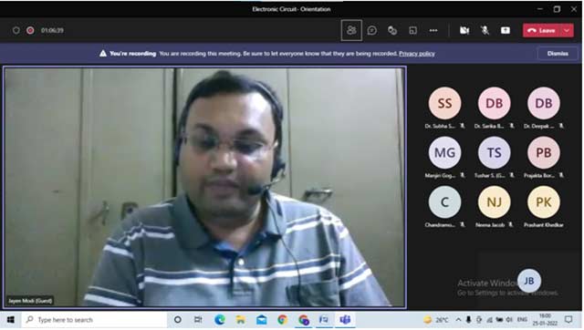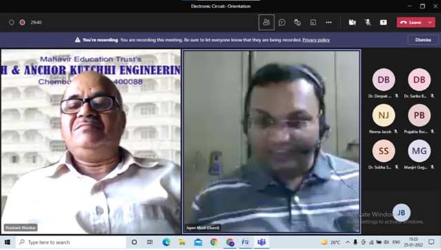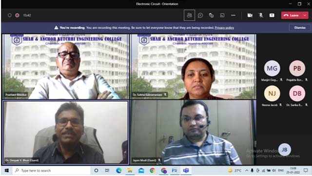 Orientation of “Electronic Circuits” , S.E.(Electronics & Computer Science Engineering ), SEM-IV -R2019 C- Scheme, AY-2021-22, was conducted on 25 January 2022. The event was organized by Department of Electronics & Computer Science Engineering, Shah and Anchor Kutchhi Engineering College, Chembur on virtual platform of Microsoft Teams. 8 faculty members from various colleges participated in this virtual orientation.Prof.Jayen Modi (FRCRCE), Dr.Deepak Bhoir (FRCRCE),Dr. Subha Subramaniam and Prof. Prashant Khedkar were the resource persons for the event.