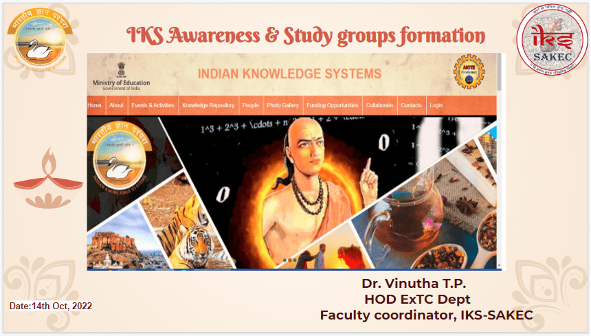 Faculty coordinators of IKS took a session, IKS awareness & Study groups formation for SAKEC staff on Oct 14th, 2022. They briefed on probable domains of interest, how the mini-project statements can be tuned towards IKS domains, and how the Literature survey of projects can incorporate our rich, ancient, traditional knowledge in scriptures. Our college faculties and lab assistants and students have expressed interest in being part of this initiative.