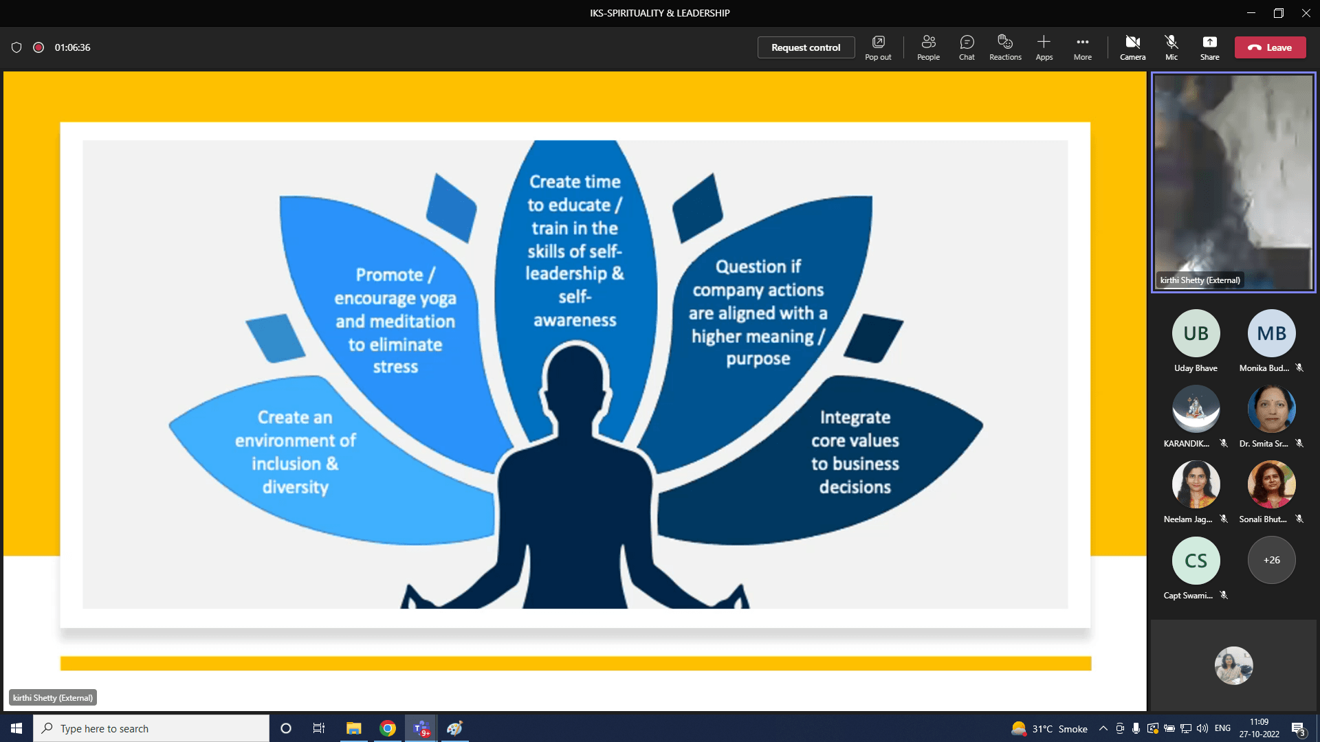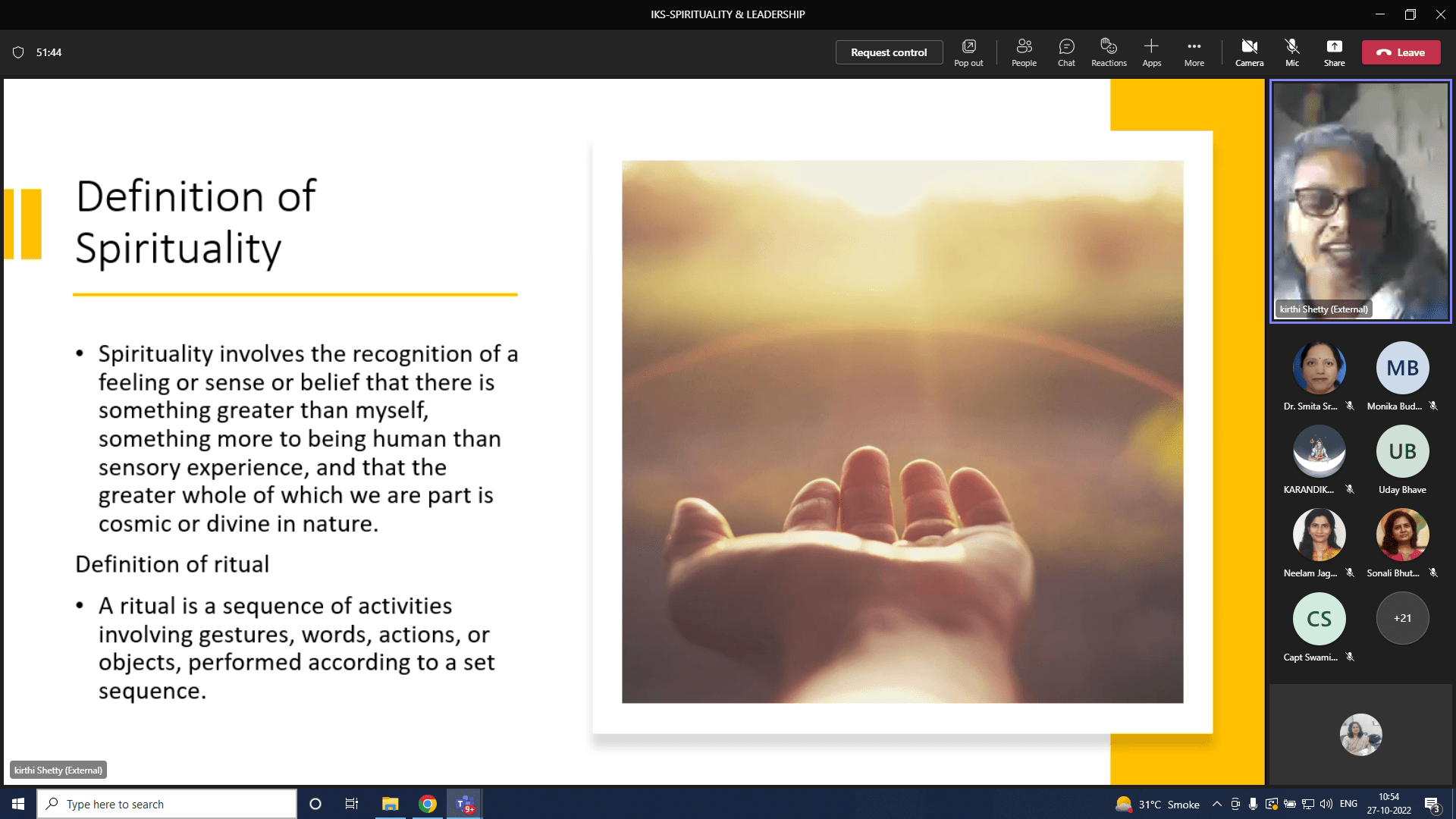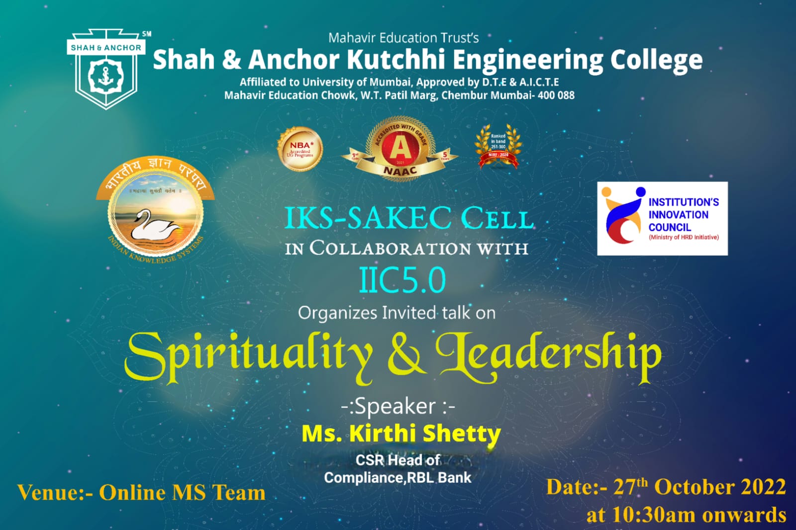 “Spirituality & Leadership” guest lecture is organized on 27th Oct, 2022, as part of personality building activities of IKS-SAKEC (Indian Knowledge Systems ) cell, based on the principles that are deep rooted in our rich culture!